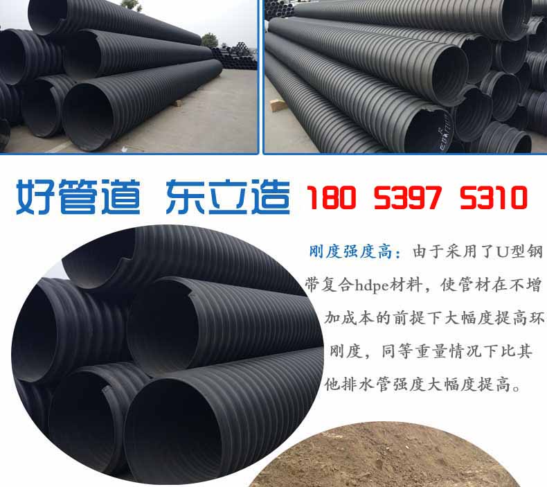 2.大口徑高強(qiáng)度:由于采用了U型鋼帶復(fù)合PE材料,使管材在不增加成本的前提下大幅度提高環(huán)剛度,同等重量情況下比其他塑料排水管強(qiáng)度大幅度提高。可解決重載等一系列問題,大口徑管材優(yōu)勢(shì)更加明顯,比水泥管和其它塑料管重量更輕、強(qiáng)度更高。