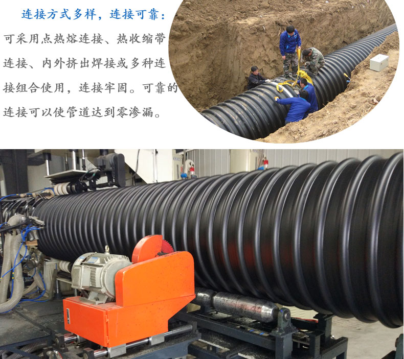1.連接方式多樣,連接可靠 :可采用電熱熔連接、熱收縮帶連接、內(nèi)外擠出焊接或多種連接組合使用,連接牢固。可靠的連接可以使管道達(dá)到零滲漏。